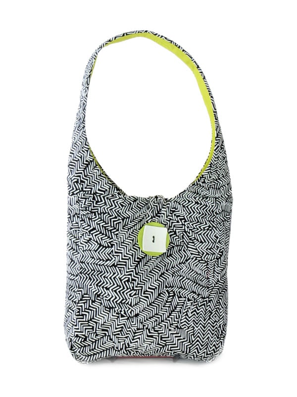 Young Vanessa Vargas-Wilson of Crafty Gemini, a multi-faceted, hugely talented designer and maker, has created one of my all-time favorite fabrics! Flow, contrast, lively forms, twisted paths. The simple high contrast black and white palette belie an interesting composition - a treat for the eye and for the hand in smooth, cool cotton! The interior contains seven pockets and a key leash. The exterior sports a flip phone - or whatever! - pocket on the gusset. The body of the purse is approximately 12" wide and 13" deep; the arc of the handle is about 27"; the purse stands about 25" tall. Shipping is usually under $10 by Priority Mail.